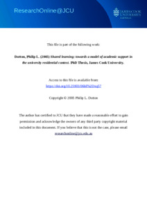 Dutton, Philip L. (2005) Shared learning: towards a model of academic support in the university residential context. PhD thesis, James Cook University.