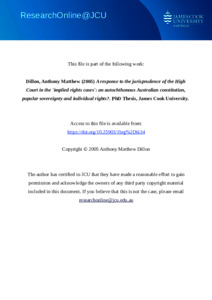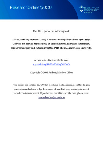 Dillon, Anthony Matthew (2005) A response to the jurisprudence of the High Court in the 'implied rights cases': an autochthonous Australian constitution, popular sovereignty and individual rights? PhD thesis, James Cook University.