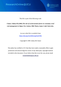 Cinner, Joshua Eli (2005) The role of socioeconomic factors in customary coral reef management in Papua New Guinea. PhD thesis, James Cook University.