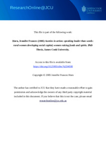 Horn, Jennifer Frances (2005) Aunties in action: speaking louder than words: rural women developing social capital, women raising funds and spirits. PhD thesis, James Cook University.