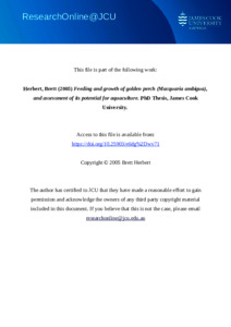 Herbert, Brett (2005) Feeding and growth of golden perch (Macquaria ambigua), and assessment of its potential for aquaculture. PhD thesis, James Cook University.