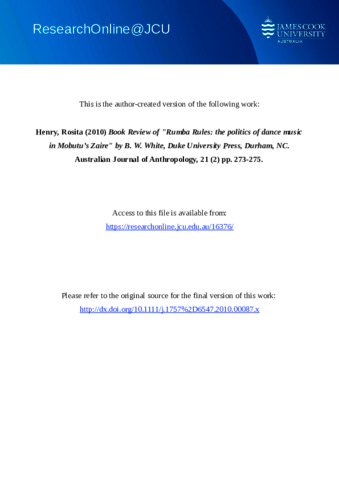 Henry, Rosita (2010) Book Review of "Rumba Rules: the politics of dance music in Mobutu’s Zaire" by B. W. White, Duke University Press, Durham, NC. Australian Journal of Anthropology, 21 (2). pp. 273-275.