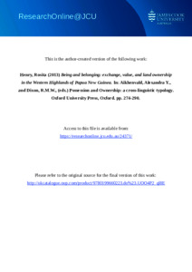 Henry, Rosita (2013) Being and belonging: exchange, value, and land ownership in the Western Highlands of Papua New Guinea. In: Aikhenvald, Alexandra Y., and Dixon, R.M.W., (eds.) Possession and Ownership: a cross-linguistic typology. Explorations in Linguistic Typology . Oxford University Press, Oxford, pp. 274-290.