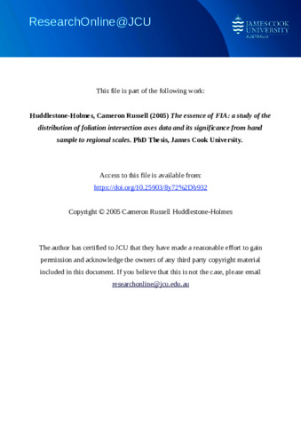 Huddlestone-Holmes, Cameron Russell (2005) The essence of FIA: a study of the distribution of foliation intersection axes data and its significance from hand sample to regional scales. PhD thesis, James Cook University.