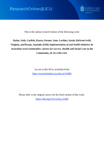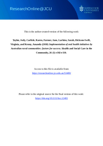 Taylor, Judy, Carlisle, Karen, Farmer, Jane, Larkins, Sarah, Dickson-Swift, Virginia, and Kenny, Amanda (2018) Implementation of oral health initiatives by Australian rural communities: factors for success. Health and Social Care in the Community, 26 (1). e102-e110.