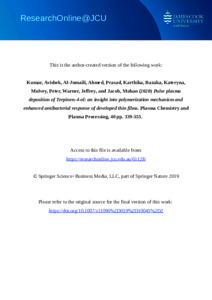 Kumar, Avishek, Al-Jumaili, Ahmed, Prasad, Karthika, Bazaka, Kateryna, Mulvey, Peter, Warner, Jeffrey, and Jacob, Mohan (2020) Pulse plasma deposition of Terpinen-4-ol: an insight into polymerization mechanism and enhanced antibacterial response of developed thin films. Plasma Chemistry and Plasma Processing, 40. pp. 339-355.