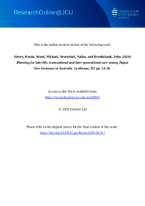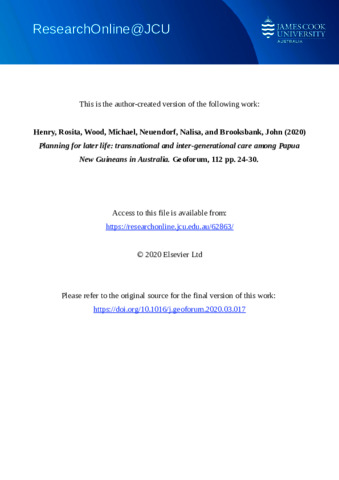 Henry, Rosita, Wood, Michael, Neuendorf, Nalisa, and Brooksbank, John (2020) Planning for later life: transnational and inter-generational care among Papua New Guineans in Australia. Geoforum, 112. pp. 24-30.