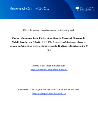 Karimi, Mohammad Reza, Karimi, Amir Hossein, Abolmaali, Shamsozoha, Mehdi, Sadeghi, and Schmitz, Ulf (2022) Prospects and challenges of cancer systems medicine: from genes to disease networks. Briefings in Bioinformatics, 23 (1). bbab343.