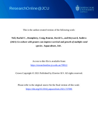 Neil, Rachel C., Humphrey, Craig, Bourne, David G., and Heyward, Andrew (2021) Co-culture with grazers can improve survival and growth of multiple coral species. Aquaculture, 544. 737095.
