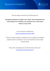 Rajashekhar, Manjunath, Jennings, Ernest, Abbott, John, and Thomson, Peter (2022) Making it real: stimulation in the simulation clinic. Faculty Dental Journal, 13 (2). pp. 82-88.