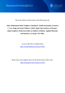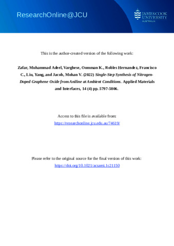 Zafar, Muhammad Adeel, Varghese, Oomman K., Robles Hernandez, Francisco C., Liu, Yang, and Jacob, Mohan V. (2022) Single-Step Synthesis of Nitrogen-Doped Graphene Oxide from Aniline at Ambient Conditions. Applied Materials and Interfaces, 14 (4). pp. 5797-5806.
