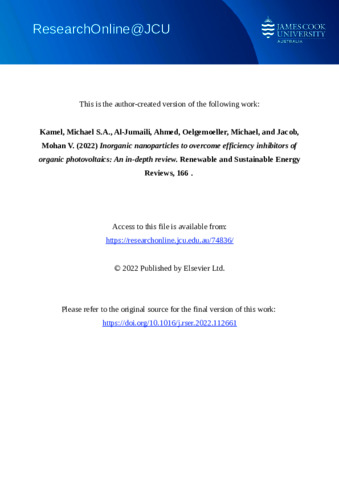 Kamel, Michael S.A., Al-Jumaili, Ahmed, Oelgemoeller, Michael, and Jacob, Mohan V. (2022) Inorganic nanoparticles to overcome efficiency inhibitors of organic photovoltaics: An in-depth review. Renewable and Sustainable Energy Reviews, 166. 112661.