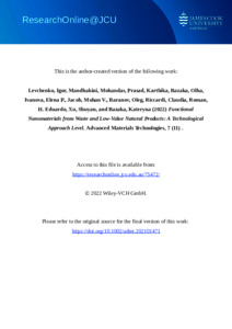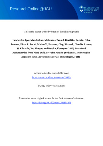 Levchenko, Igor, Mandhakini, Mohandas, Prasad, Karthika, Bazaka, Olha, Ivanova, Elena P., Jacob, Mohan V., Baranov, Oleg, Riccardi, Claudia, Roman, H. Eduardo, Xu, Shuyan, and Bazaka, Kateryna (2022) Functional Nanomaterials from Waste and Low-Value Natural Products: A Technological Approach Level. Advanced Materials Technologies, 7 (11). 2101471.