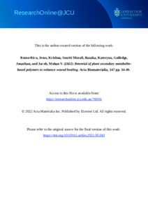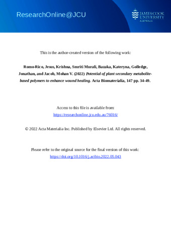 Romo-Rico, Jesus, Krishna, Smriti Murali, Bazaka, Kateryna, Golledge, Jonathan, and Jacob, Mohan V. (2022) Potential of plant secondary metabolite-based polymers to enhance wound healing. Acta Biomaterialia, 147. pp. 34-49.