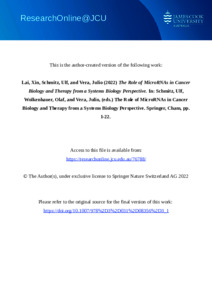 Lai, Xin, Schmitz, Ulf, and Vera, Julio (2022) The Role of MicroRNAs in Cancer Biology and Therapy from a Systems Biology Perspective. In: Schmitz, Ulf, Wolkenhauer, Olaf, and Vera, Julio, (eds.) The Role of MicroRNAs in Cancer Biology and Therapy from a Systems Biology Perspective. Advances in Experimental Medicine and Biology, 1385 . Springer, Cham, pp. 1-22.