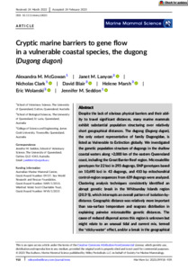 McGowan, Alexandra M., Lanyon, Janet M., Clark, Nicholas, Blair, David, Marsh, Helene, Wolanski, Eric, and Seddon, Jennifer M. (2023) Cryptic marine barriers to gene flow in a vulnerable coastal species, the dugong (Dugong dugon). Marine Mammal Science, 39 (3). pp. 918-939.