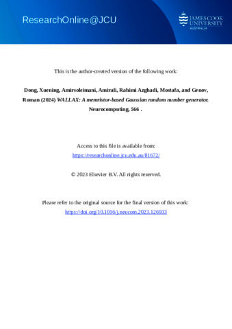 Dong, Xuening, Amirsoleimani, Amirali, Rahimi Azghadi, Mostafa, and Genov, Roman (2024) WALLAX: A memristor-based Gaussian random number generator. Neurocomputing, 566. 126933.
