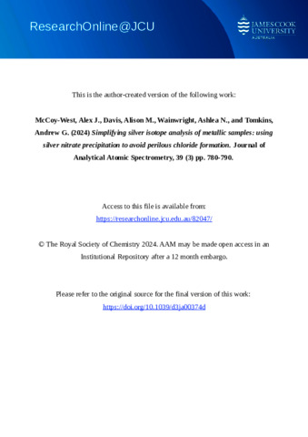 McCoy-West, Alex J., Davis, Alison M., Wainwright, Ashlea N., and Tomkins, Andrew G. (2024) Simplifying silver isotope analysis of metallic samples: using silver nitrate precipitation to avoid perilous chloride formation. Journal of Analytical Atomic Spectrometry, 39 (3). pp. 780-790.