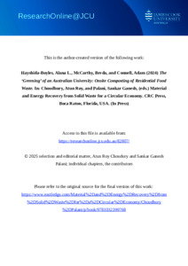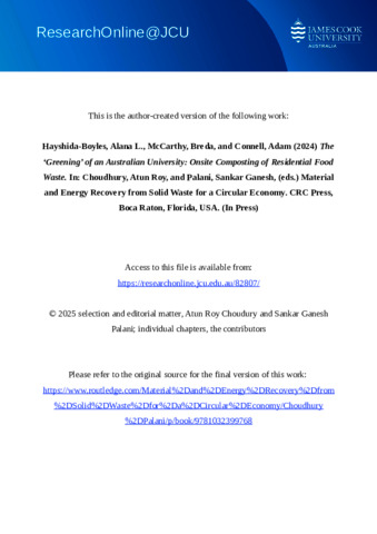 Hayshida-Boyles, Alana L., McCarthy, Breda, and Connell, Adam (2024) The ‘Greening’ of an Australian University: Onsite Composting of Residential Food Waste. In: Choudhury, Atun Roy, and Palani, Sankar Ganesh, (eds.) Material and Energy Recovery from Solid Waste for a Circular Economy. CRC Press, Boca Raton, Florida, USA.