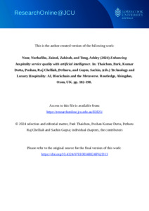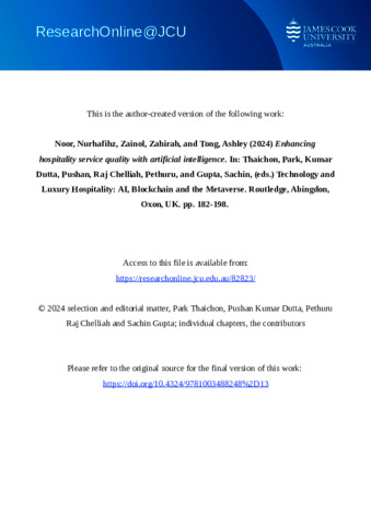 Noor, Nurhafihz, Zainol, Zahirah, and Tong, Ashley (2024) Enhancing hospitality service quality with artificial intelligence. In: Thaichon, Park, Kumar Dutta, Pushan, Raj Chelliah, Pethuru, and Gupta, Sachin, (eds.) Technology and Luxury Hospitality: AI, Blockchain and the Metaverse. Routledge Studies in Luxury Management . Routledge, Abingdon, Oxon, UK, pp. 182-198.