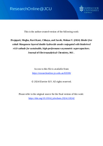 Prajapati, Megha, Ravi Kant, Chhaya, and Jacob, Mohan V. (2024) Binder free cobalt Manganese layered double hydroxide anode conjugated with bioderived rGO cathode for sustainable, high-performance asymmetric supercapacitors. Journal of Electroanalytical Chemistry, 961. 118242.