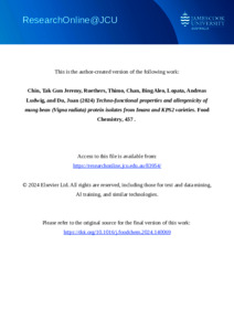 Chin, Tak Gun Jeremy, Ruethers, Thimo, Chan, Bing Aleo, Lopata, Andreas Ludwig, and Du, Juan (2024) Techno-functional properties and allergenicity of mung bean (Vigna radiata) protein isolates from Imara and KPS2 varieties. Food Chemistry, 457. 140069.