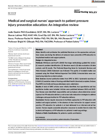 Deakin, Jodie, Latimer, Sharon, Walker, Rachel M., and Gillespie, Brigid M. (2023) Medical and surgical nurses' approach to patient pressure injury prevention education: An integrative review. Journal of Clinical Nursing, 32 (19-20). pp. 6951-6966.