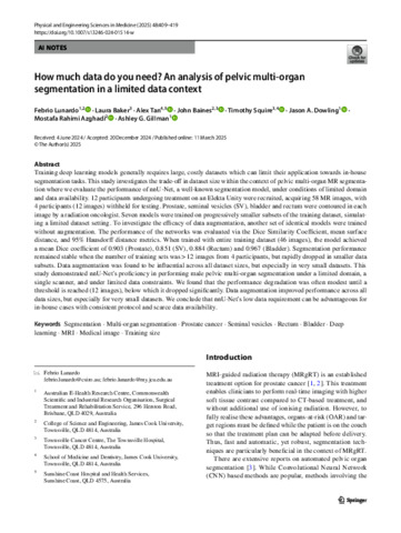 Lunardo, Febrio, Baker, Laura, Tan, Alex, Baines, John, Squire, Timothy, Dowling, Jason A., Rahimi Azghadi, Mostafa, and Gillman, Ashley G. (2025) How Much Data Do You Need? An Analysis of Pelvic Multi-Organ Segmentation in a Limited Data Context. Physical and Engineering Sciences in Medicine, 48. pp. 409-419.