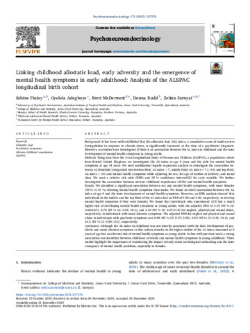 Finlay, Sabine, Adegboye, Oyelola, McDermott, Brett, Rudd, Donna, and Sarnyai, Zoltan (2025) Linking childhood allostatic load, early adversity and the emergence of mental health symptoms in early adulthood: Analysis of the ALSPAC longitudinal birth cohort. Psychoneuroendocrinology, 172. 107276.