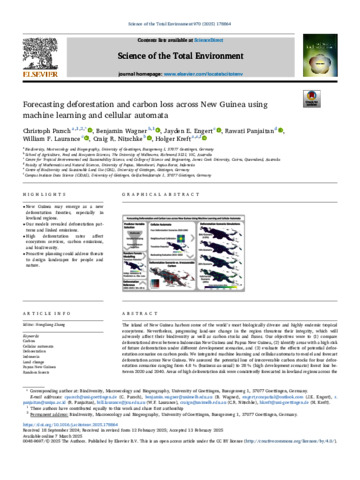 Parsch, Christoph, Wagner, Benjamin, Engert, Jayden e., Panjaitan, Rawati, Laurance, William F., Nitschke, Craig R., and Kreft, Holger (2025) Forecasting deforestation and carbon loss across New Guinea using machine learning and cellular automata. Science of the Total Environment, 970. 178864.
