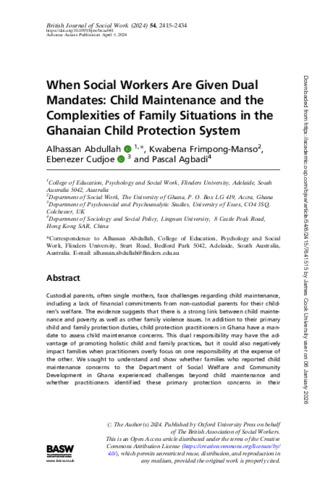 Abdullah, Alhassan, Frimpong-Manso, Kwabena, Cudjoe, Ebenezer, and Agbadi, Pascal (2024) When Social Workers Are Given Dual Mandates: Child Maintenance and the Complexities of Family Situations in the Ghanaian Child Protection System. The British Journal of Social Work, 54. pp. 2415-2434.