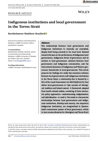 Stanford, Bartholomew Matthew (2023) Indigenous institutions and local government in the Torres Strait. Australian Journal of Public Administration, 82 (3). pp. 308-324.