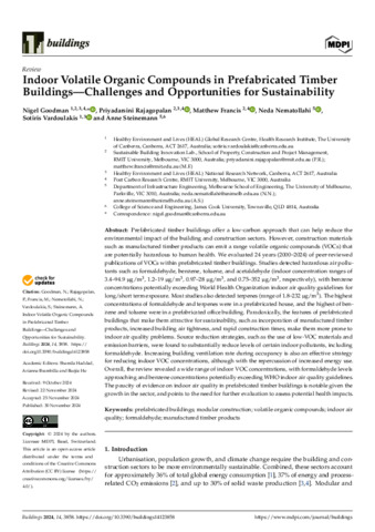 Goodman, Nigel, Rajagopalan, Priyadarsini, Francis, Matthew, Nematollahi, Neda, Vardoulakis, Sotiris, and Steinemann, Anne (2024) Indoor Volatile Organic Compounds in Prefabricated Timber Buildings—Challenges and Opportunities for Sustainability. Buildings, 14. 3858.