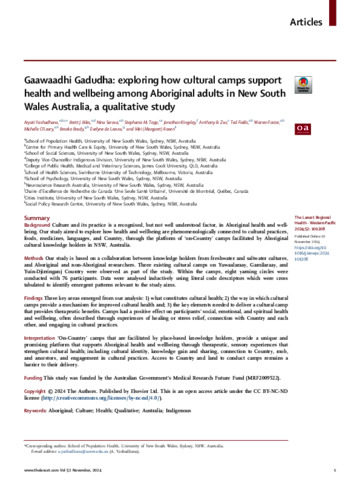 Yashadhana, Aryati, Biles, Brett J., Serova, Nina, Topp, Stephanie M., Kingsley, Jonathan, Zwi, Anthony B., Fields, Ted, Foster, Warren, O’Leary, Michelle, Brady, Brooke, de Leeuw, Evelyne, and Raven, Miri (Margaret) (2024) Gaawaadhi Gadudha: exploring how cultural camps support health and wellbeing among Aboriginal adults in New South Wales Australia, a qualitative study. The Lancet Regional Health - Western Pacific, 52. 101208.