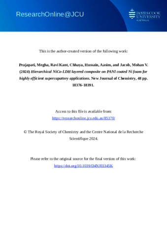 Prajapati, Megha, Ravi Kant, Chhaya, Hussain, Aasim, and Jacob, Mohan V. (2024) Hierarchical NiCo-LDH layered composite on PANI coated Ni foam for highly efficient supercapattery applications. New Journal of Chemistry, 48. pp. 18376-18391.