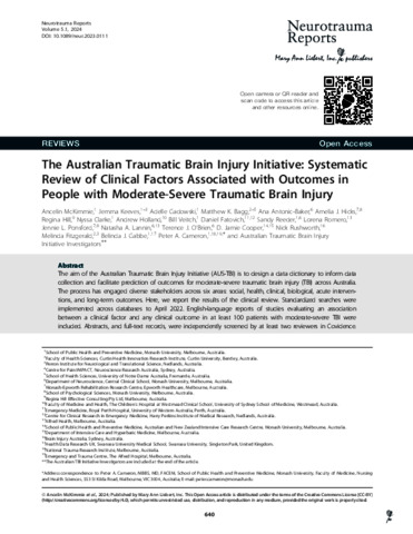 McKimmie, Ancelin, Keeves, Jemma, Gadowski, Adelle, Bagg, Matthew K., Antonic-Baker, Ana, Hicks, Amelia J., Hill, Regina, Clarke, Nyssa, Holland, Andrew, Veitch, Bill, Fatovich, Daniel, Reeder, Sandy, Romero, Lorena, Ponsford, Jennie L., Lannin, Natasha A., O’Brien, Terence J., Cooper, D. Jamie, Rushworth, Nick, Fitzgerald, Melinda, Gabbe, Belinda J., Cameron, Peter A., Australian Traumatic Brain Injury Initiative Investigators, [Cullen, Jennifer], and [Ellis, Daniel Y.] (2024) The Australian Traumatic Brain Injury Initiative: Systematic Review of Clinical Factors Associated with Outcomes in People with Moderate-Severe Traumatic Brain Injury. Neurotrauma Reports, 5 (1). pp. 640-659.