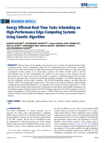 Hussain, Hameed, Zakarya, Muhammad, Ali, Ahmad, Khan, Ayaz Ali, Chalak Qazani, Mohammad Reza, Al-Bahri, Mahmood, and Haleem, Muhammad (2024) Energy efficient real-time tasks scheduling on high-performance edge-computing systems using genetic algorithm. IEEE Access, 12. pp. 54879-54892.