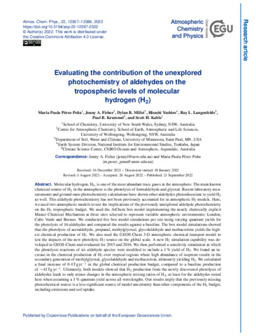 Pérez-Peña, Maria Paula, Fisher, Jenny A., Millet, Dylan B., Yashiro, Hisashi, Langenfelds, Ray L., Krummel, Paul B., and Kable, Scott H. (2022) Evaluating the contribution of the unexplored photochemistry of aldehydes on the tropospheric levels of molecular hydrogen (H2). Atmospheric Chemistry and Physics, 22 (18). pp. 12367-12386.