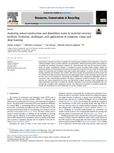 Langley, Adrian, Lonergan, Matthew, Huang, Tao, and Rahimi Azghadi, Mostafa (2025) Analyzing mixed construction and demolition waste in material recovery facilities: Evolution, challenges, and applications of computer vision and deep learning. Resources, Conservation and Recycling, 217. 108218.