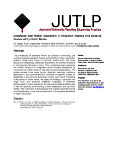 Roe, Jasper, Perkins, Mike, and Furze, Leon (2024) Deepfakes and Higher Education: A Research Agenda and Scoping Review of Synthetic Media. Journal of University Teaching and Learning Practice, 21 (10).
