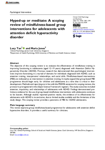 Tan, Lucy Boon Gek, and Jones, Maria (2024) Hyped-up or meditate: A scoping review of mindfulness-based group interventions for adolescents with attention deficit hyperactivity disorder. Clinical Child Psychology and Psychiatry, 29 (4). pp. 1383-1399.