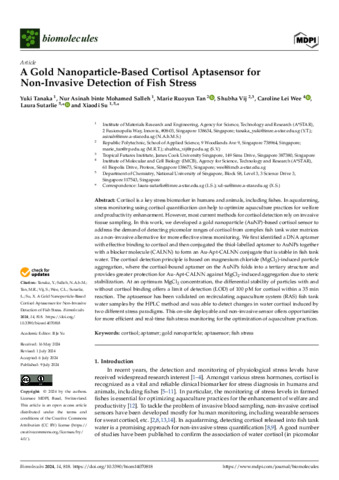 Tanaka, Yuki, Salleh, Nur Asinah binte Mohamed, Tan, Marie Ruoyun, Vij, Shubha, Wee, Caroline Lei, Sutarlie, Laura, and Su, Xiaodi (2024) A Gold Nanoparticle-Based Cortisol Aptasensor for Non-Invasive Detection of Fish Stress. Biomolecules, 14 (7). 818.