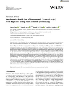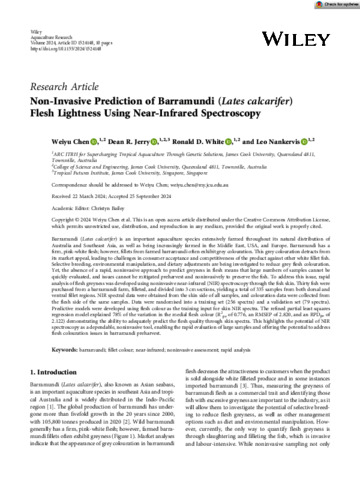 Chen, Weiyu, Jerry, Dean R., White, Ronald D., and Nankervis, Leo (2024) Non-Invasive Prediction of Barramundi (Lates calcarifer) Flesh Lightness Using Near-Infrared Spectroscopy. Aquaculture Research, 2024 (1). 1524148.