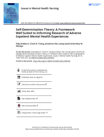 Raeburn, Toby, Chang, Claire R., Kuek, Jonathan Han Loong, and Ndwiga, Dorothy W. (2024) Self-Determination Theory: A Framework Well Suited to Informing Research of Adverse Inpatient Mental Health Experiences. Issues in Mental Health Nursing, 45 (10). pp. 1046-1053.