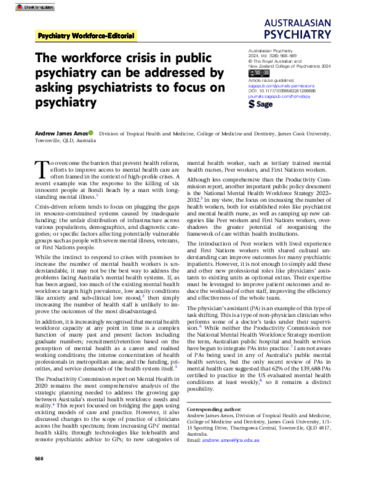 Amos, Andrew James (2024) The workforce crisis in public psychiatry can be addressed by asking psychiatrists to focus on psychiatry. Australasian Psychiatry, 32 (6). pp. 568-569.