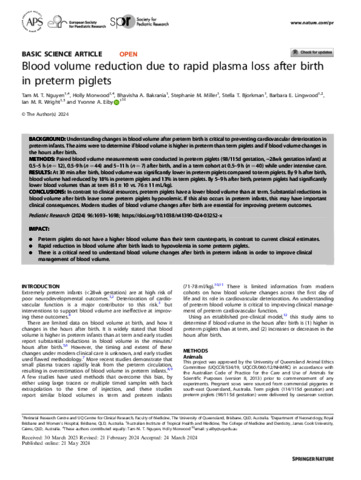 Nguyen, Tam M.T., Morwood, Holly, Bakrania, Bhavisha A., Miller, Stephanie M., Bjorkman, Stella T., Lingwood, Barbara E., Wright, Ian M.R., and Eiby, Yvonne A. (2024) Blood volume reduction due to rapid plasma loss after birth in preterm piglets. Pediatric Research, 96 (7). pp. 1693-1698.