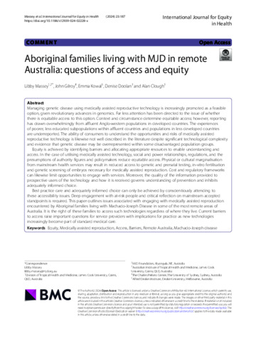 Massey, Libby, Gilroy, John, Kowal, Emma, Doolan, Denise, and Clough, Alan (2024) Aboriginal families living with MJD in remote Australia: questions of access and equity. International Journal for Equity in Health, 23 (1). 187.