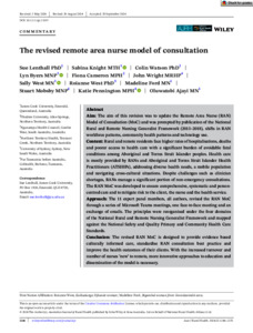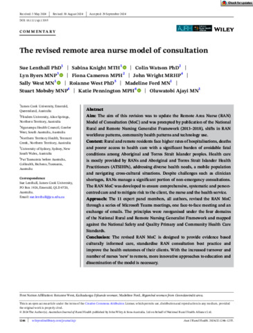 Lenthall, Sue, Knight, Sabina, Watson, Colin, Byers, Lyn, Cameron, Fiona, Wright, John, West, Sally, West, Roianne, Ford, Madeline, Mobsby, Stuart, Pennington, Katie, and Ajayi, Oluwatobi (2024) The revised remote area nurse model of consultation. Australian Journal of Rural Health, 32 (6). pp. 1246-1255.