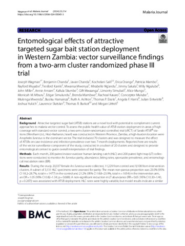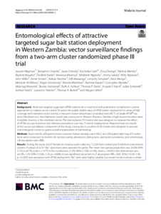 Wagman, Joseph, Chanda, Benjamin, Chanda, Javan, Saili, Kochelani, Orange, Erica, Mambo, Patricia, Muyabe, Rayford, Kaniki, Tresford, Mwenya, Mwansa, Ng’andu, Mirabelle, Sakala, Jimmy, Ngulube, Willy, Miller, John, Arnzen, Annie, Silumbe, Kafula, Mwaanga, Gift, Simubali, Limonty, Mungo, Alice, Mburu, Monicah M., Simulundu, Edgar, Mambwe, Brenda, Kasaro, Racheal, Mulube, Conceptor, Mwenda, Mulenga, Hamainza, Busiku, Ashton, Ruth A., Eisele, Thomas P., Harris, Angela F., Entwistle, Julian, Yukich, Joshua, Slutsker, Laurence, Burkot, Thomas R., and Littrell, Megan (2024) Entomological effects of attractive targeted sugar bait station deployment in Western Zambia: vector surveillance findings from a two-arm cluster randomized phase III trial. Malaria Journal, 23 (1). 214.