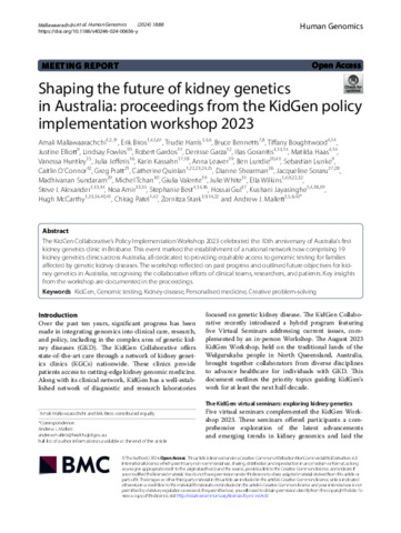Mallawaarachchi, Amali, Biros, Erik, Harris, Trudie, Bennetts, Bruce, Boughtwood, Tiffany, Elliott, Justine, Fowles, Lindsay, Gardos, Robert, Garza, Denisse, Goranitis, Ilias, Haas, Matilda, Huntley, Vanessa, Jefferis, Julia, Kassahn, Karin, Leaver, Anna, Lundie, Ben, Lunke, Sebastian, O’Connor, Caitlin, Pratt, Greg, Quinlan, Catherine, Shearman, Dianne, Soraru, Jacqueline, Sundaram, Madhivanan, Tchan, Michel, Valente, Giulia, White, Julie, Wilkins, Ella, Alexander, Steve I., Amir, Noa, Best, Stephanie, Gul, Hossai, Jayasinghe, Kushani, McCarthy, Hugh, Patel, Chirag, Stark, Zornitza, and Mallett, Andrew J. (2024) Shaping the future of kidney genetics in Australia: proceedings from the KidGen policy implementation workshop 2023. Human Genomics, 18 (1). 88.